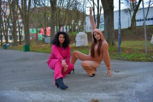 Next came the bench. It wasn’t just a bench it was a stage, a prop, and a trampoline of sorts. Nina perched elegantly, crossing one leg over the other, smiling like she had been born for the spotlight. SiSa hopped beside her, alternating exaggerated model poses with silly faces. Passersby smiled or double-took, unsure if they were watching a fashion editorial or a comedy sketch.