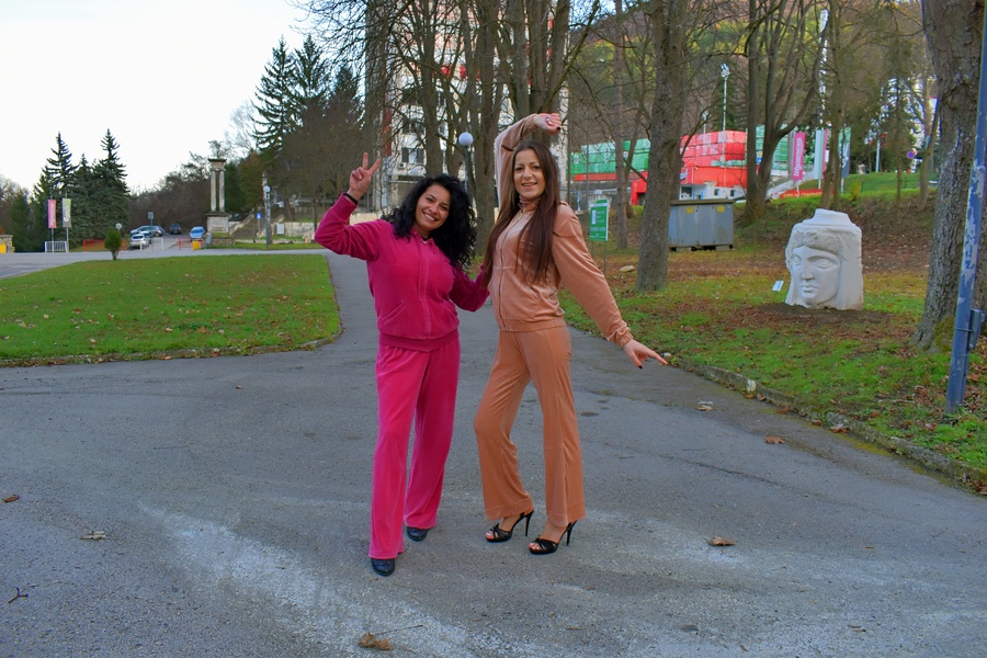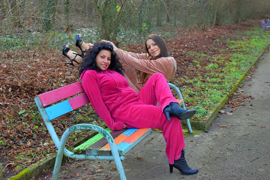 Next came the bench. It wasn’t just a bench it was a stage, a prop, and a trampoline of sorts. Nina perched elegantly, crossing one leg over the other, smiling like she had been born for the spotlight. SiSa hopped beside her, alternating exaggerated model poses with silly faces. Passersby smiled or double-took, unsure if they were watching a fashion editorial or a comedy sketch.