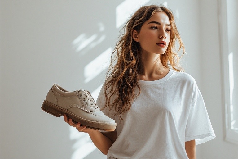 Never underestimate a woman holding shoes in an oversized white T-shirt. She’s probably just one tap away from greatness.