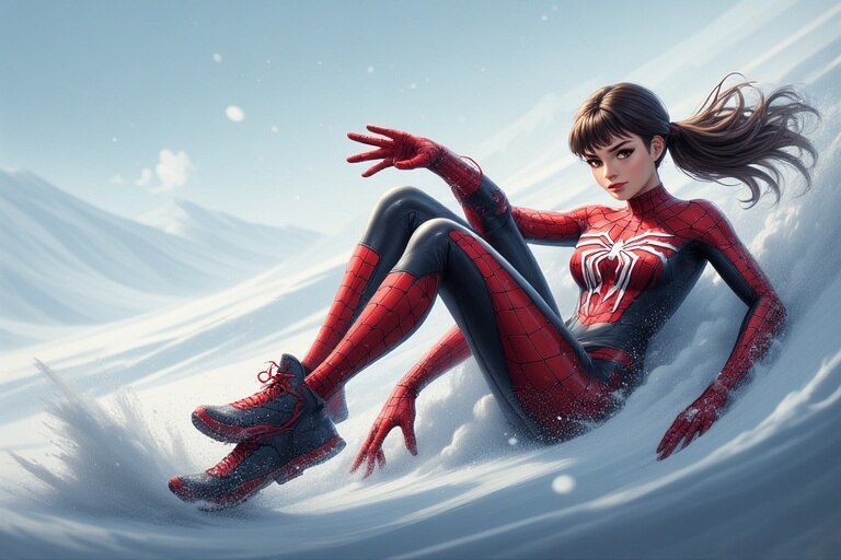 And then it happened. A smooth patch of snow betrayed her heroic stride. One second she was walking with the poise of a comic-book heroine, the next she was sliding arms flailing, pigtails bouncing, and Spider Girl mask slightly askew. “Crime-fighting requires style AND balance!” she shouted mid-slide, snow flying in every direction like confetti at a winter parade.