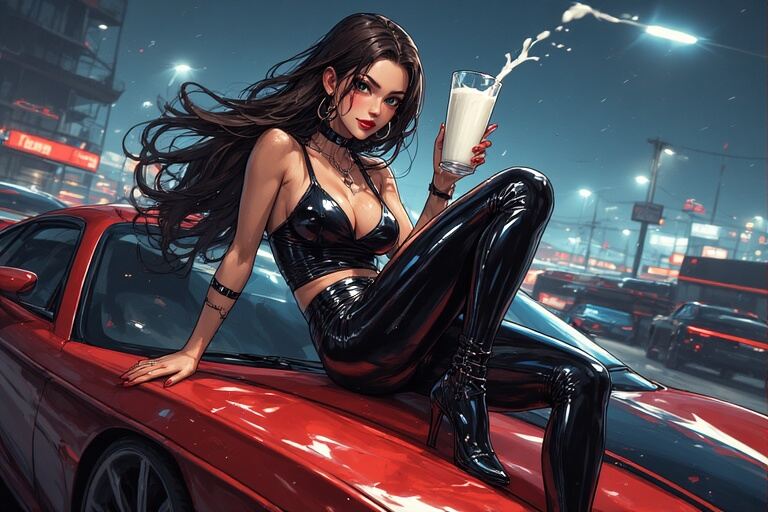 Yvonne had a way of making even the simplest moments feel like a music video. Dressed in a shiny wetlook leather top and matching leggings, high heels clicking confidently against the pavement, she strolled outside with her car waiting like a loyal sidekick. In one hand, a glass of milk; on her lips, a carefree “Lalala” that made the air itself feel cheerful.