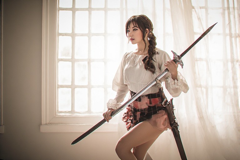 Then comes the pose. Feet planted firmly, one hand gripping the sword, the other resting casually on her hip, she channels a perfect balance of playful attitude and fierce power. Her mini skirt swings slightly as she shifts her stance, proving that style and strength can coexist in the most unexpected ways. Every angle, every tilt of her head, every subtle flick of the sword adds to the story she’s telling one of bold confidence and unapologetic charm.