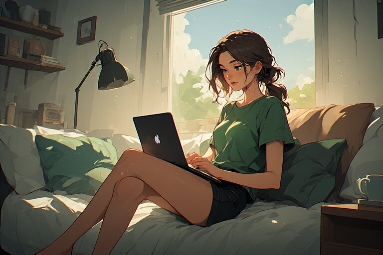 Her posture was relaxed but attentive, a perfect balance of focus and charm. She leaned back slightly, stretched her arms, and smiled at the screen. The green of her shirt reflected the sunlight, giving her an almost glowing aura, while the black shorts added just the right amount of casual confidence. Every keystroke seemed intentional, every glance at the screen deliberate, like a perfectly choreographed scene of productivity-meets-playfulness.
