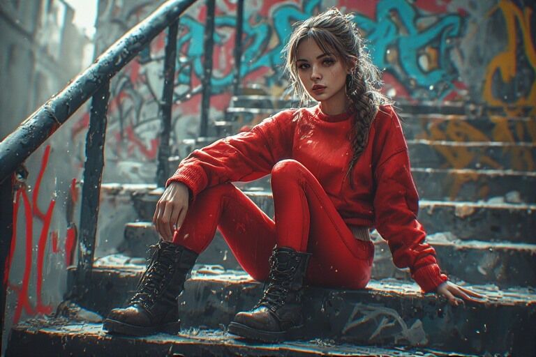 Sitting casually on the stairs, she looked like she had just stepped out of a bold street-style photoshoot. She wore a striking red long-sleeve top paired with matching red leggings that caught the light with every small movement. The bright color stood out against the gritty surroundings, especially next to the colorful graffiti splashed across the nearby wall.