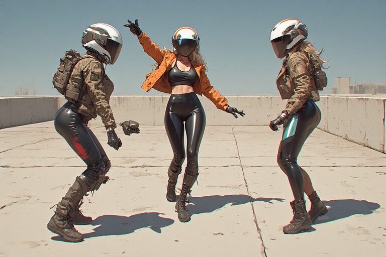 The sun beat down warmly, casting crisp shadows across the rooftop, highlighting the strength and elegance of every stance. The ladies began with slow, deliberate movements, feet planted firmly on the concrete. There was a precision to their dance, a silent communication that made every gesture feel intentional even without moving from their spots. The helmets added a playful, adventurous edge, hinting at mischief and style in equal measure.