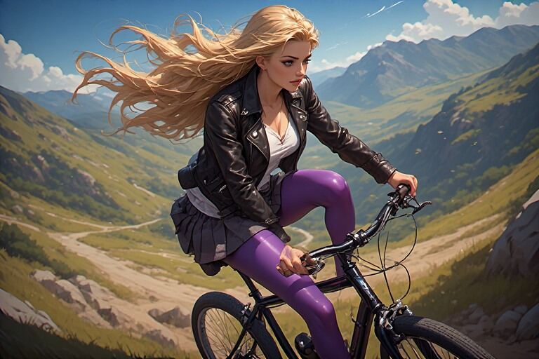On a bright, unapologetically sunny morning, a blonde lady decided that today was the day to conquer both hills and vibes. Dressed like she walked straight out of a stylish daydream purple pantyhose hugging every pedal-powered move, a sleek wetlook skirt catching the light just right, and a leather jacket that said “I mean business, but make it fashion” she hopped onto her bicycle like a woman on a mission.