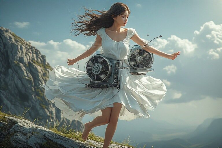 There was something both impressive and quietly amusing about it all a flowing white dress, a windy hill, and a fan-powered flight that felt like imagination had teamed up with invention just for the day.